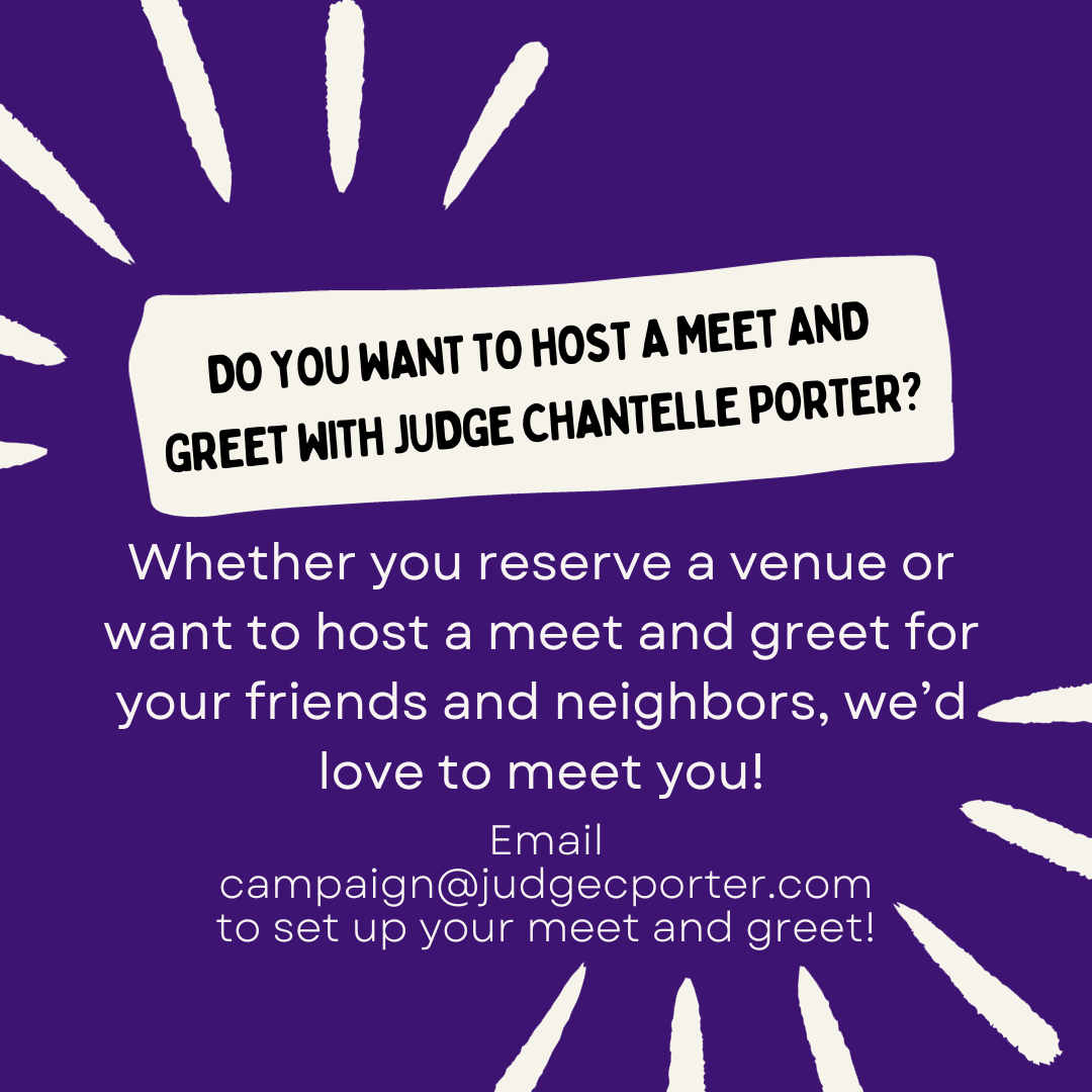 We'd love to set up a meet and greet with you so that you, your friends, neighbors, or organization can meet Judge Chantelle! A meet and greet can be something as simple as an evening at your home with your community. If you'd like to set up a meet and greet, please email ereh and we'd be happy to meet you!